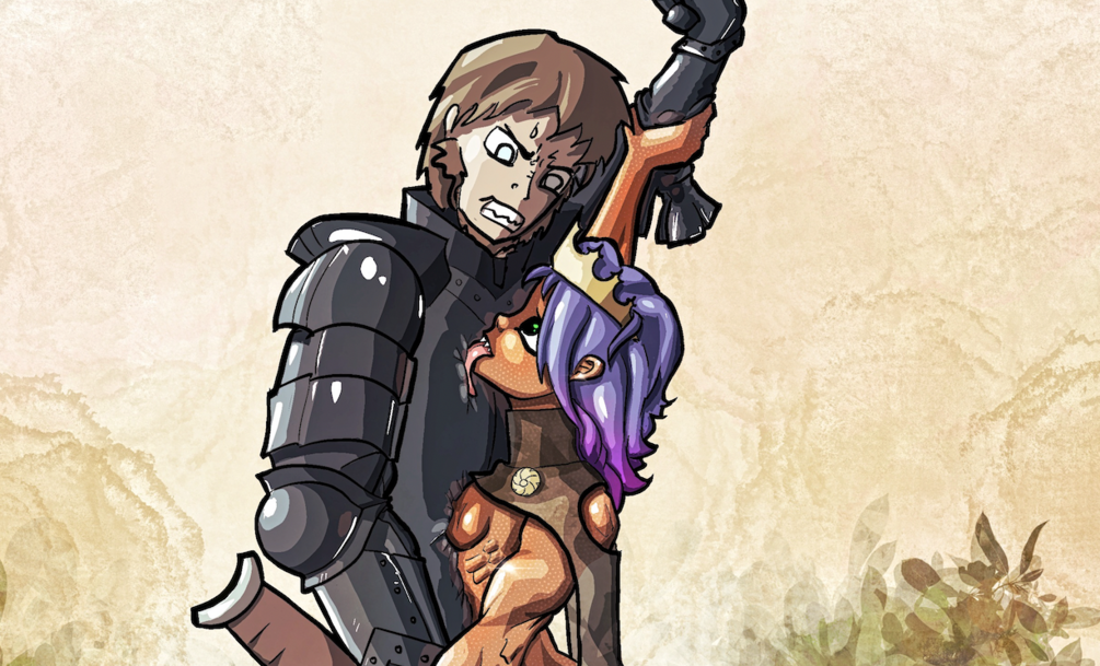 A high res image of a muscular super-powered princess pissing off a knight and playing with his sword